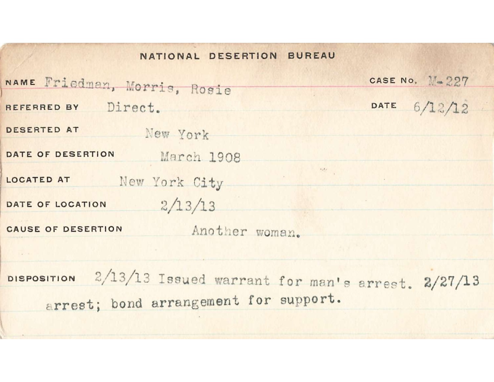 The National Desertion Bureau was established in New York in 1911 with the goal of tracking down men who had abandoned their wives. The Bureau aimed to bring these men to justice, force them to pay child support, and where possible, effect a reconciliation between husband and wife. It worked with hundreds of organizations nationally and internationally to find missing men, and publicized its cases in the press, most famously in the Jewish Daily Forward’s “Gallery of Missing Husbands.”
