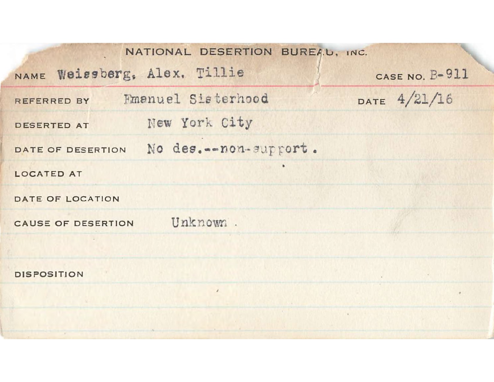 While the cards are fascinating as standalone documents, they are also the portal to the much more extensive case files that the National Desertion Bureau created. Some of these case files continued for hundreds of pages, like that of Lena and Morris Adler, whose story you can read here. Others filled only a few pages.