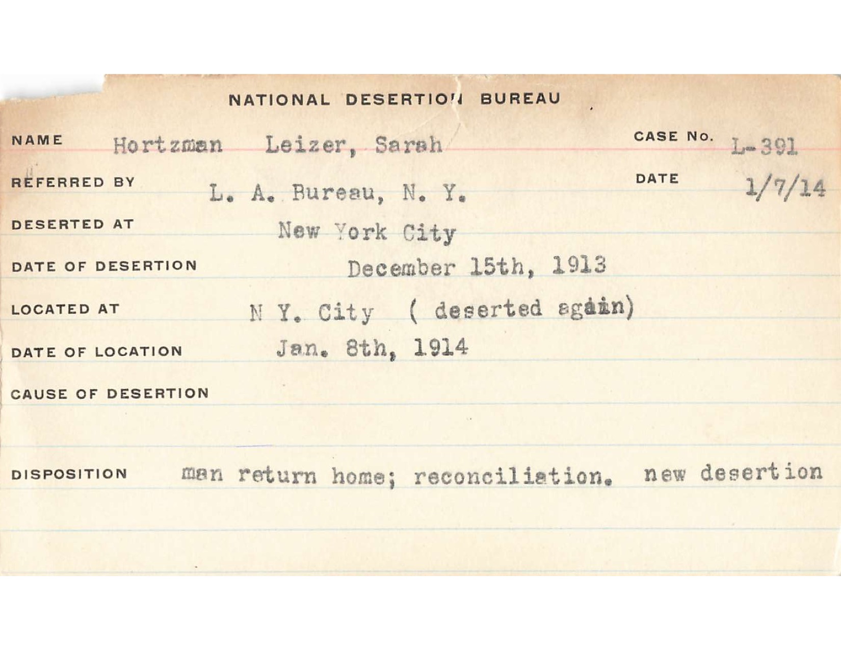 This database is comprised of data extracted from 18,000 cards dated 1911-1935, from the card catalog of the NDB. The cards almost always included a case number, the name of the husband and wife, the referring organization, and the date of the case opening. Sometimes, the Bureau’s investigators recorded other details, like where the desertion occurred and when, where and when the man had been found, the cause of desertion, and the “disposition”––the results of the investigation.