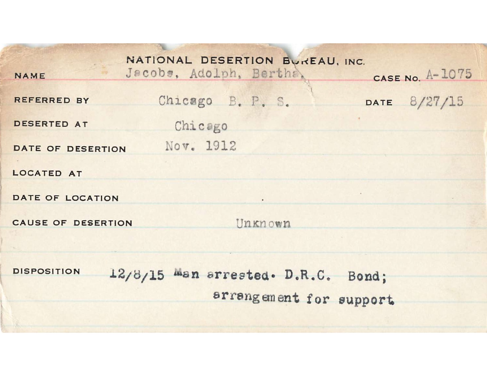 While the cards are fascinating as standalone documents, they are also the portal to the much more extensive case files that the National Desertion Bureau created. Some of these case files continued for hundreds of pages, like that of Lena and Morris Adler, whose story you can read here. Others filled only a few pages.