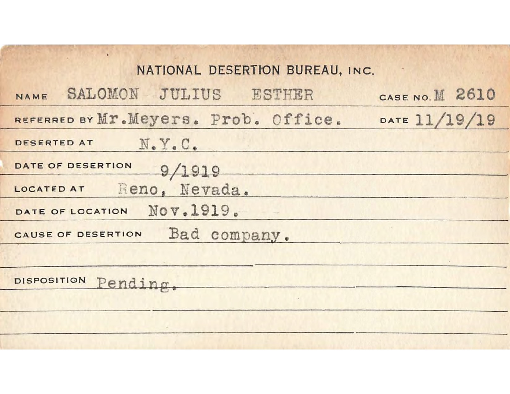 While the cards are fascinating as standalone documents, they are also the portal to the much more extensive case files that the National Desertion Bureau created. Some of these case files continued for hundreds of pages, like that of Lena and Morris Adler, whose story you can read here. Others filled only a few pages.