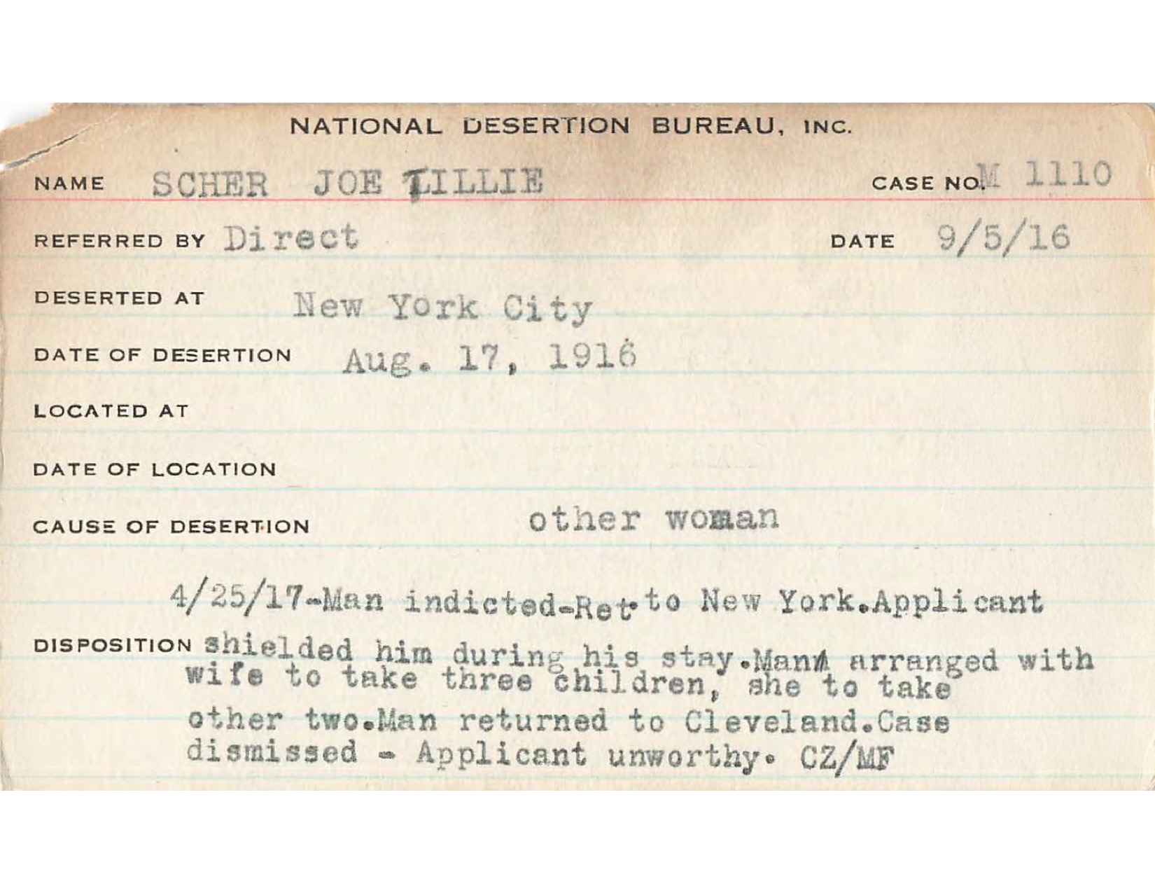 This database is comprised of data extracted from 18,000 cards dated 1911-1935, from the card catalog of the NDB. The cards almost always included a case number, the name of the husband and wife, the referring organization, and the date of the case opening. Sometimes, the Bureau’s investigators recorded other details, like where the desertion occurred and when, where and when the man had been found, the cause of desertion, and the “disposition”––the results of the investigation.